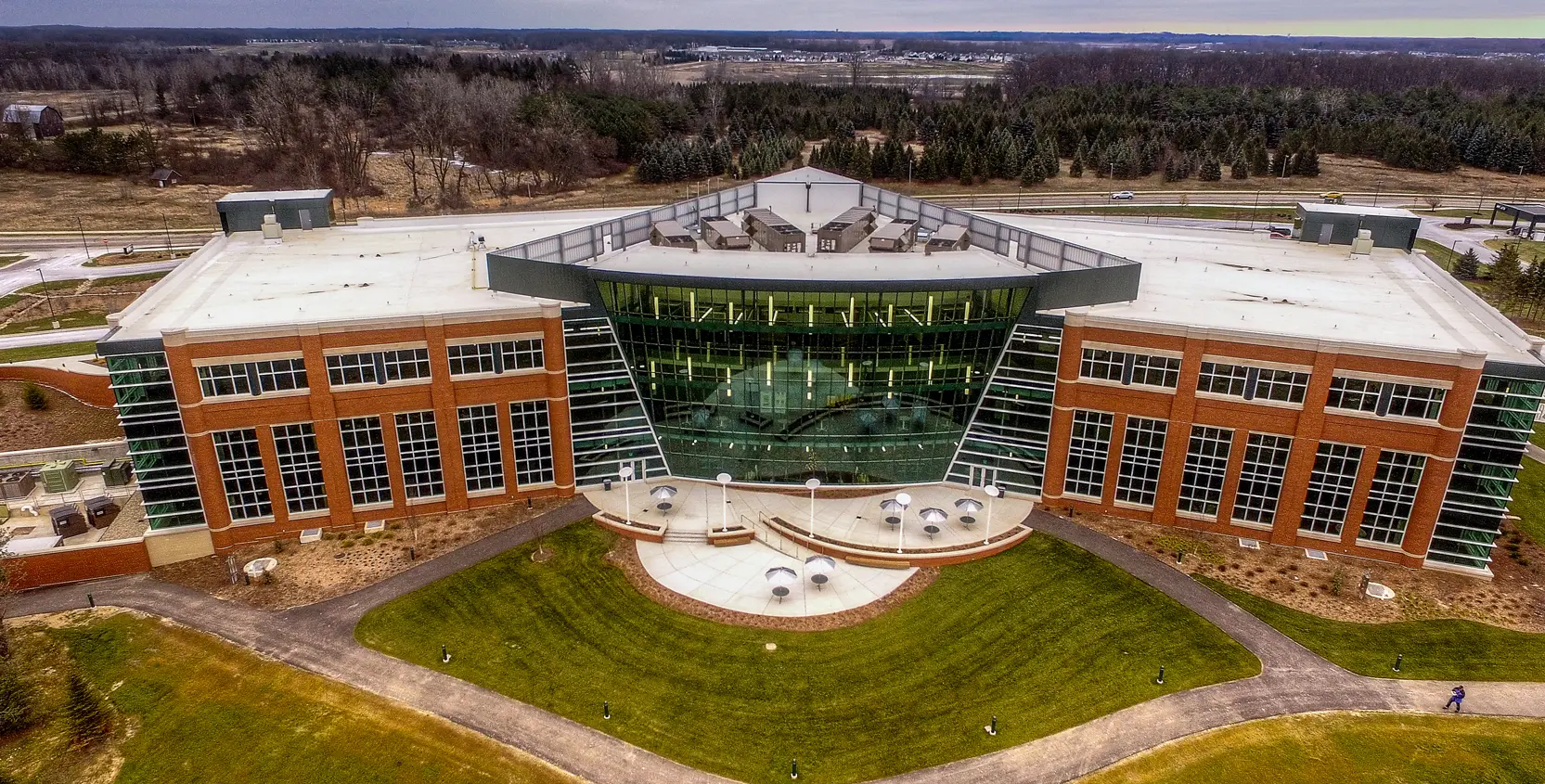 This is a second corporate headquarters building on the company’s current headquarters campus in East Lansing, Michigan. The expansion project helps meet the demands of the growing membership base and can house 564 employees. The new, 186,350 square foot, three-story facility is built using high-efficiency, environmentally-friendly and locally-sourced products. Key features of the project include a high-profile radiused curtainwall; unique “V” tube structures at main and employee entrances; state-of-the-art technology throughout; raised floor system, providing flexibility as staffing requirements change; and extensive use of windows/natural lighting for energy efficiency and to provide views of the pond.